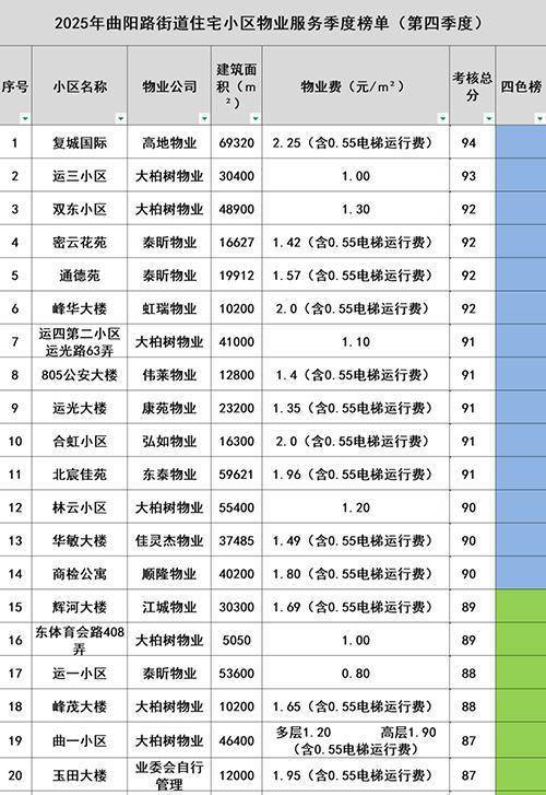 2025年第四季度物业服务榜单(截取部分)。曲阳路街道供图